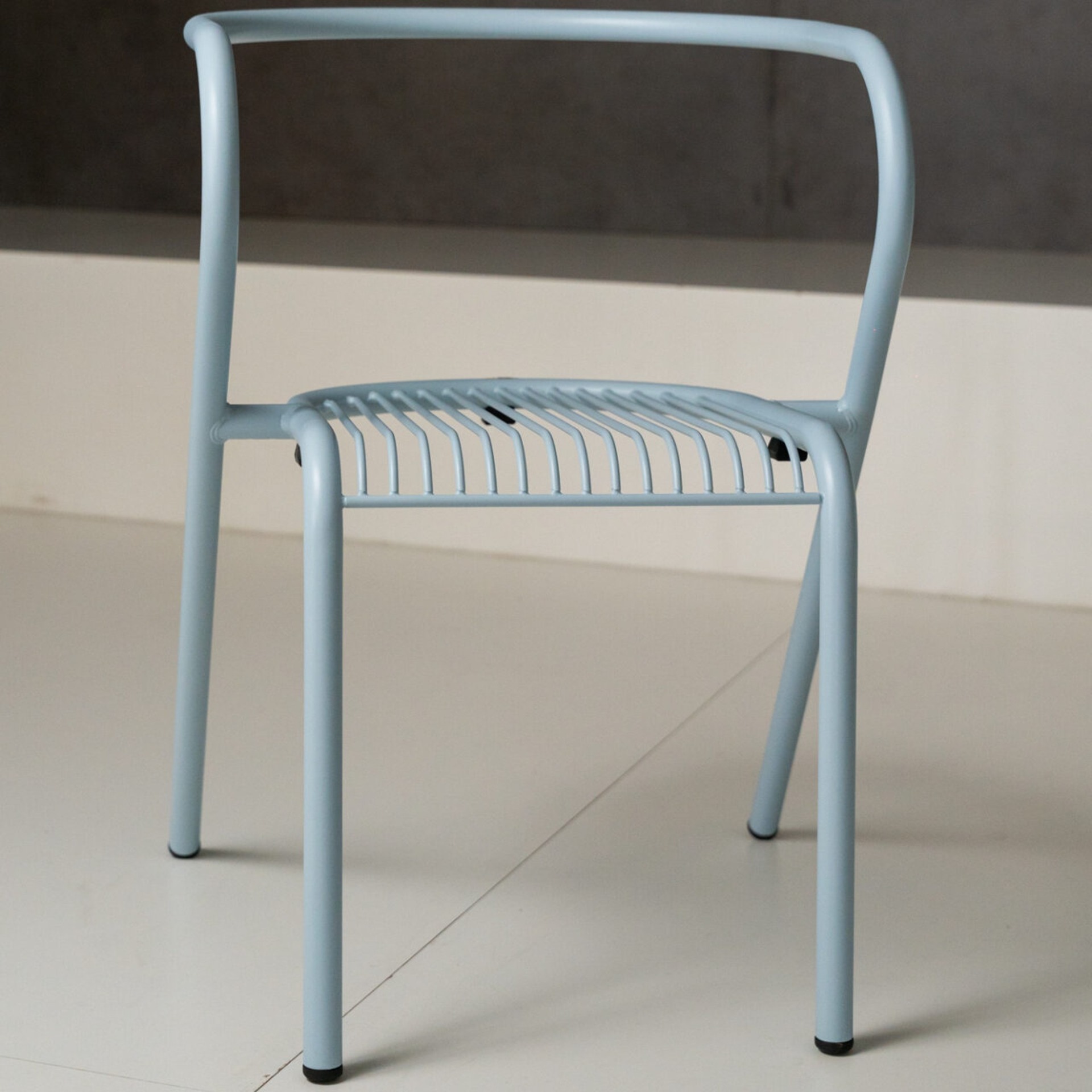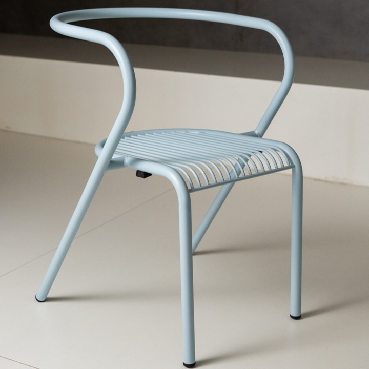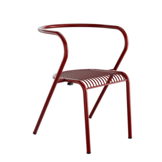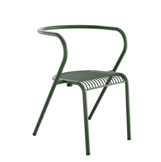 Zakřivené opěradlo přirozeně obepíná záda a vytváří pohodlnou oporu. Díky práškové povrchové úpravě je vhodná pro interiér i exteriér.