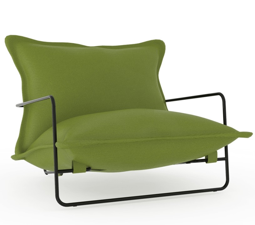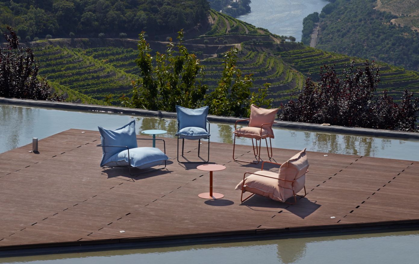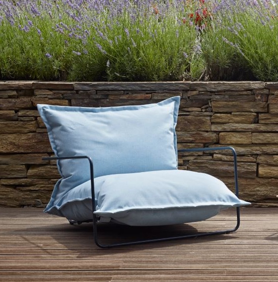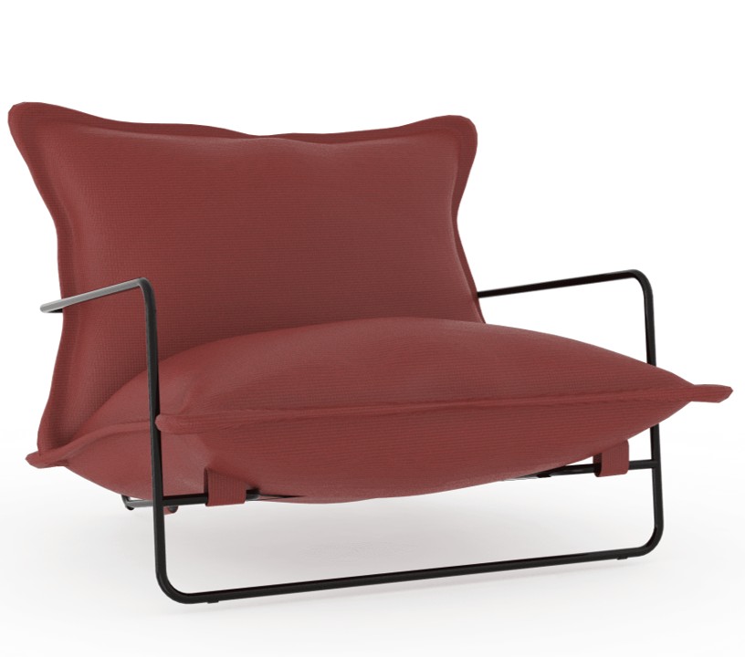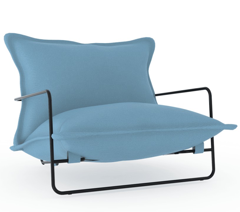 Měkké polštáře vytvářejí kontrast k subtilní kovové konstrukci. Výsledkem je moderní, uvolněný design vhodný pro hotelové terasy, kavárny, rezidenční projekty i soukromé zahrady.