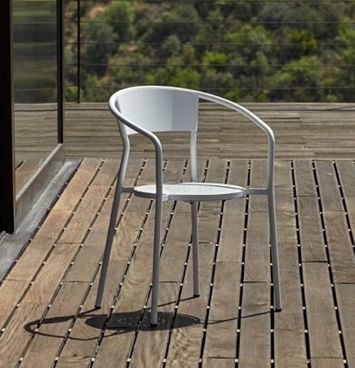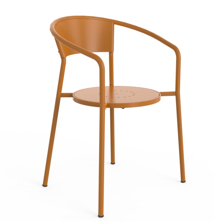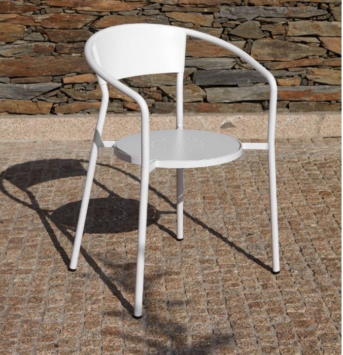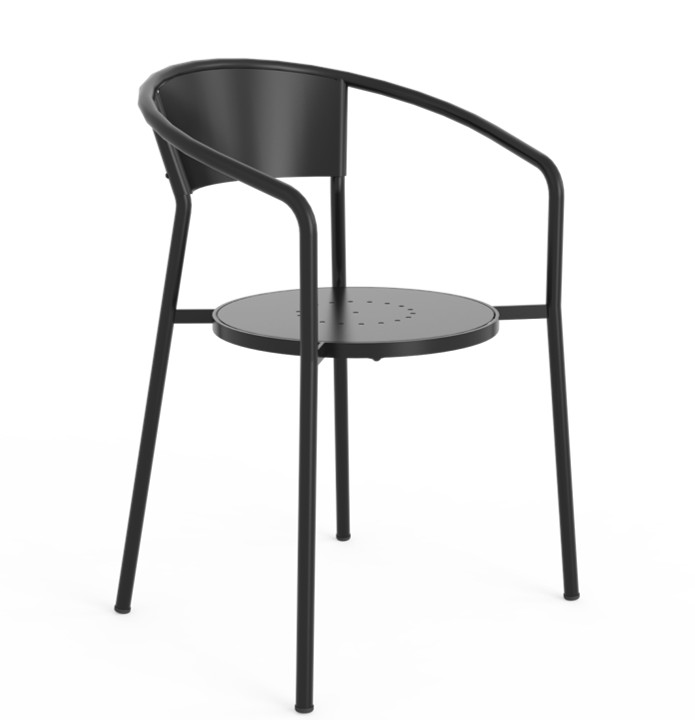 Kulatý perforovaný sedák zajišťuje odvod vody a snadnou údržbu, což z ní dělá ideální volbu pro venkovní použití. Díky svému designu se hodí jak na moderní terasy, tak do stylových gastro provozů.